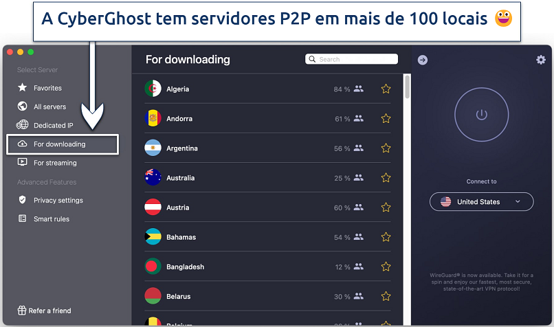 2. CyberGhost: servidores otimizados para P2P garantem conexões suaves e seguras