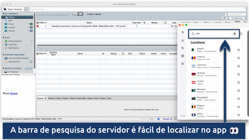 Rede de servidores | Mais de 3.000 servidores em 105 países, incluindo Brasil e Portugal, para compartilhamento de arquivos P2P rápido |