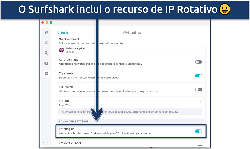 Algumas VPNs oferecem esse recurso, o qual, combinado com criptografia, é uma ótima opção para dificultar o rastreamento do seu endereço IP real. Uma dessas VPNs é o Surfshark com sua função de IP Rotativo.