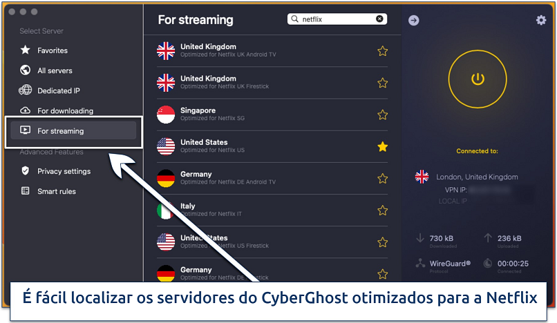 Melhor recurso | Servidores de streaming otimizados para Netflix em vários países evitam a necessidade de descobrir qual é a melhor opção |