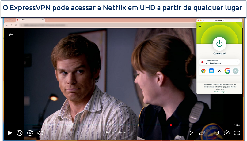 O ExpressVPN é meu favorito porque é a VPN mais rápida para transmitir a Netflix. Durante nossos testes mais recentes, nós nos conectamos a servidores no Reino Unido e registramos uma velocidade média de download de 226.07 Mbps (uma redução de apenas 1% em relação à nossa conexão de base). Isso nos permitiu transmitir o catálogo da Netflix Reino Unido em UHD sem problemas. O ExpressVPN também não teve problemas para transmitir outros 20 catálogos da Netflix com a melhor qualidade possível.