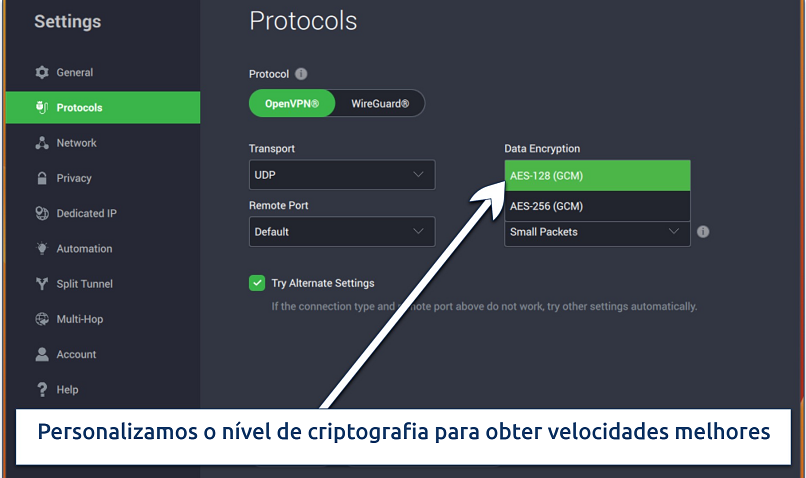 Suas opções avançadas de personalização são particularmente úteis para otimizar sua conexão para a Netflix. Embora o WireGuard tenha nos proporcionado as melhores velocidades para streaming (apenas 5% de redução em um servidor próximo no Reino Unido), você poderá preferir usar o OpenVPN, pois ele é um pouco mais seguro. O PIA permite reduzir levemente o nível de criptografia com este protocolo, portanto ele é mais veloz sem sacrificar tanto a segurança.