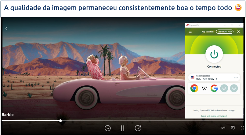 O ExpressVPN é a VPN mais rápida que testei para assistir filmes online em segurança com qualidade full HD e 4K. Ele não experimentou nenhum buffer durante o streaming de filmes no Hulu, Max, Netflix EUA e Amazon Prime Video. O teste de um servidor de Nova York reduziu a velocidade média de download dele de 126,29 Mbps para 118,8 Mbps. Essa mudança quase imperceptível não afetou em nada a qualidade do vídeo dele. O excelente desempenho da VPN se deve ao seu protocolo proprietário Lightway, que usa código mínimo para mover seus dados com mais rapidez. Também é ótimo para streaming em dispositivos móveis, pois consome menos bateria.