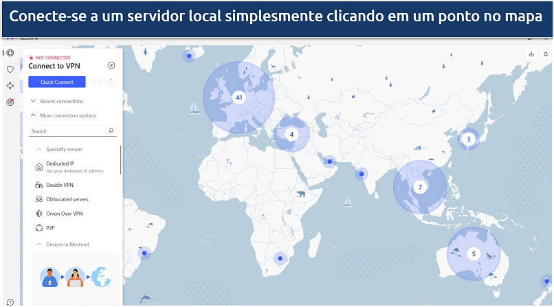 Estabelecer uma conexão para transmitir filmes com o NordVPN é simples. Os servidores são devidamente listados por país, e o mapa interativo permite selecioná-los facilmente com um pin. Durante meus testes, digitei minha localização na barra de busca, e o NordVPN me conectou ao servidor mais rápido em segundos. Além disso, você pode usar o mapa interativo para se conectar aos servidores desejados simplesmente clicando neles (soltando uma espécie de pino).