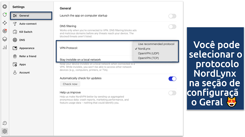 - Protocolos. Com o NordLynx e OpenVPN, você desfrutará conexões consistentemente rápidas e seguras.