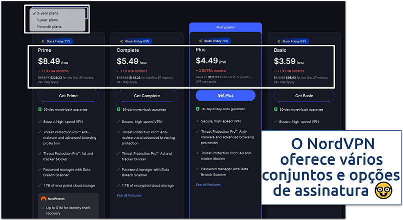 Prime | Recursos do plano Ultimate/Completo + NordProtect (serviço de proteção contra roubo de identidade) | US$ 17,99 | US$ 9,49 por mês (cobrança de US$ 142,35 no primeiro ano) | US$ 8,49 por mês (cobrança de US$ 229,23 nos dois primeiros anos) | 30 |