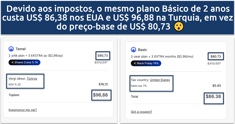 Curiosamente, os preços do NordVPN podem variar significativamente de acordo com sua localização. Isso se deve a fatores como impostos locais, condições de mercado e poder de compra regional. Por exemplo, um plano Básico de 2 anos pode custar US$ 3,99 por mês nos EUA, mas US$ 2,89 no Reino Unido e US$ 2,85 na Polônia.